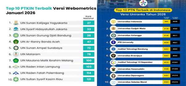 Kampus-kampus juga mampu bersaing dengan ranking dunia. Universitas Islam Negeri Sunan Kalijaga, PTKIN nomor satu di Indonesia, berhasil meraih prestasi gemilang dengan menempati peringkat 7 dunia untuk Religius Studies (studi agama) menurut SCImago Institutions Rankings (SIR) 2026. Selain itu, UIN Sunan Kalijaga juga menempati peringkat ke 37 dunia dalam bidang Theology, Divinity, and Religius Studies versi QS World University rankings by subject.